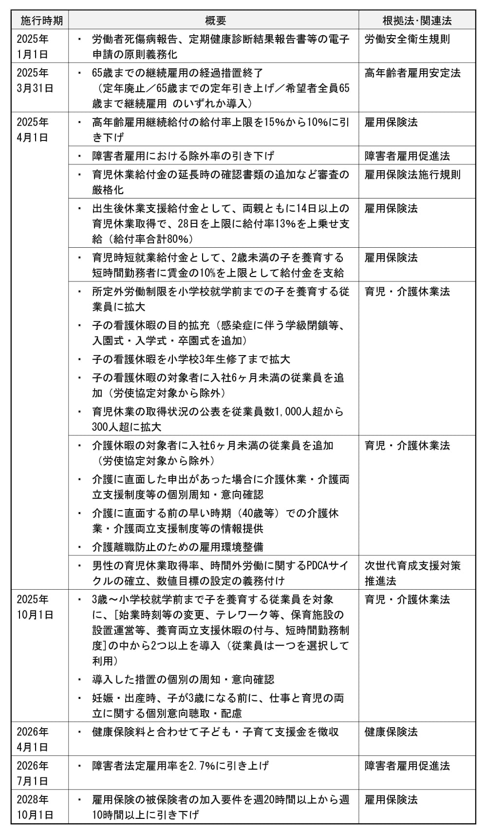 現時点で施行が決定されている主な法令改正は下表のとおりです。2025年4月と10月に改正育児・介護休業法が段階的に施行され、規程等の見直しや制度運用ルールの整備が求められます。また、出生後休業支援給付金と育児時短就業給付金が創設されることで男性の育児休業取得率の上昇や申請手続きの増加が予想されます。