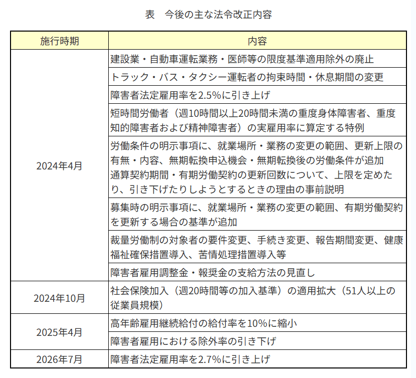 現時点で施行が決定されている主な法令改正は下表のとおりです。細かな対応として、労働条件通知書のひな形を修正したり、障害者の法定雇用率が2024年4月と2026年7月に引き上げとなることから、法定雇用率を満たしていない場合は障害者雇用を強化したりしていくなどの必要があります。