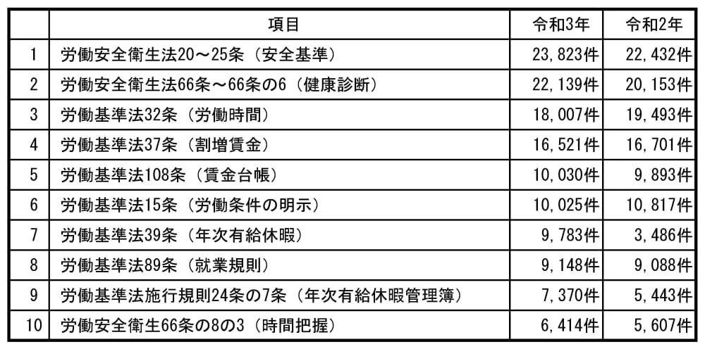 上記10項目の中で、7位の労働基準法39条(年次有給休暇)は、前年に比べて2.8倍の大幅増となっています。また、9位の労働基準法施行規則24条の7条(年次有給休暇管理簿)も前年に比べると1.4倍と急増しています。