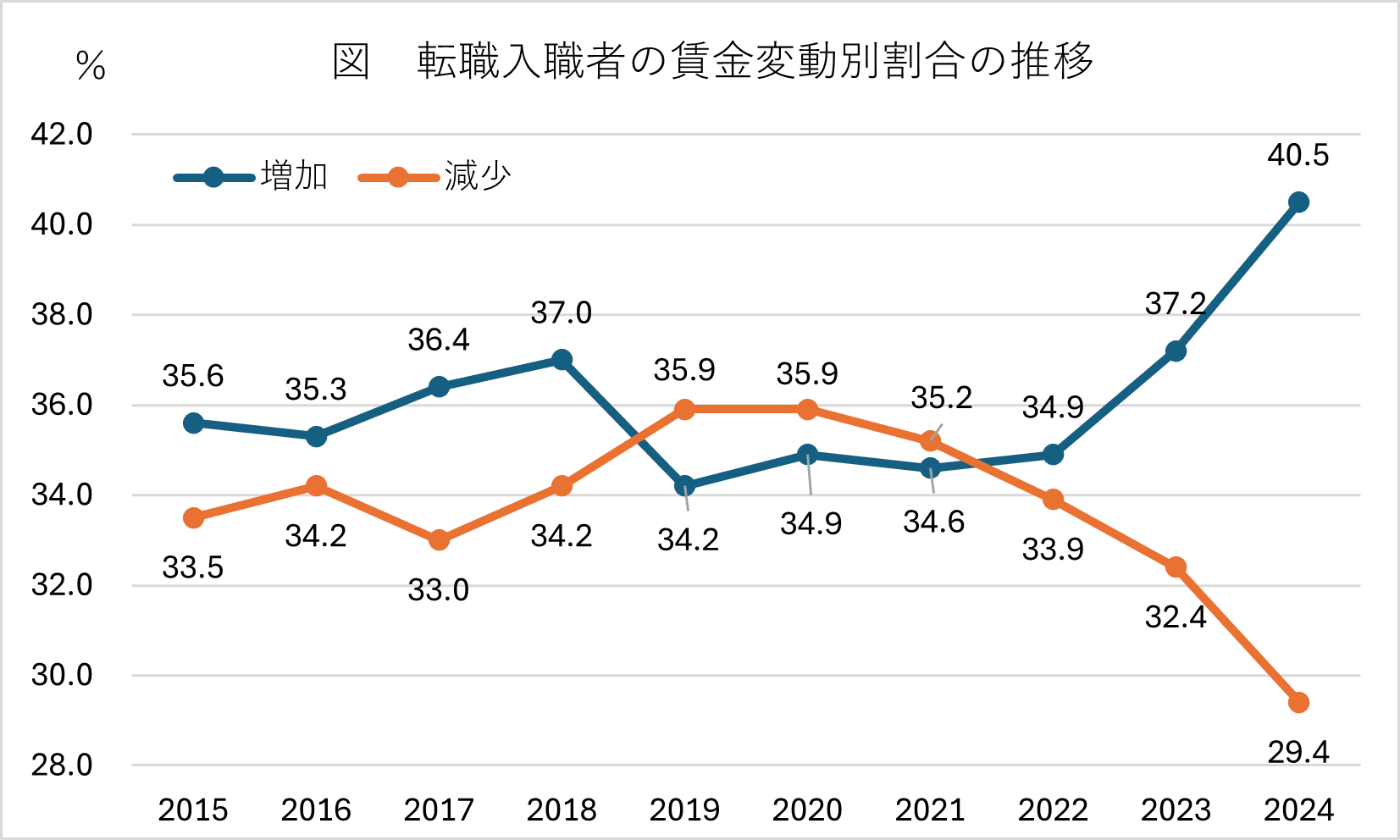 また、前年と比べると、「増加」した割合は3.3ポイント上昇し、「減少」した割合については3.0ポイント低下しています。過去10年間の転職入職者の賃金変動状況別割合の推移をみてみると、下図のようになっており、2019年から2021年にかけては前職より減少した割合が上昇した割合を上回っていましたが、2022年以降は逆転し、2024年は特にその差が顕著となりました。人手不足から、中途採用市場での賃金が上昇していることが分かります。